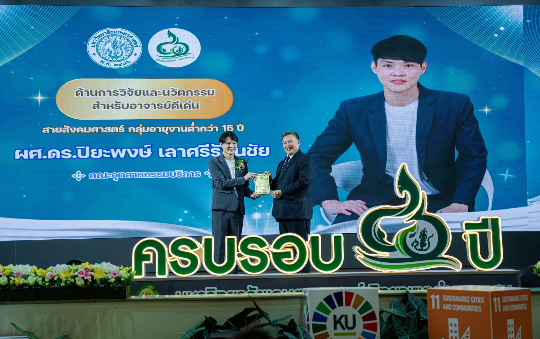 วันพุธที่ 12 พฤศจิกายน 2568 เวลา 09.30 น. มหาวิยาลัยเกษตรศาสตร์ วิทยาเขตกำแพงแสน มอบรางวัลแก่ ศิษย์เก่าดีเด่น บุคลากรดีเด่น นิสิตดีเด่น ส่วนงาน และบุคลากรที่มีผลงานโดดเด่นด้านวิจัย และบริการวิชาการ คณะอุตสาหกรรมบริการมีผู้ได้รับรางวัล 1 ท่าน ได้แก่ ผู้ช่วยศาสตราจารย์ ดร.ปิยะพงษ์ เลาศรีรัตนชัย อาจารย์ประจำหลักสูตรศิลปศาสตรบัณฑิต สาขาวิชาภาษาอังกฤษเพื่ออุตสาหกรรมบริการ คณะอุตสาหกรรมบริการ ได้รับ 2 รางวัล ได้แก่ 1.รางวัลบุคลากรดีเด่นสายวิชาการ ด้านการวิจัยและนวัตกรรมสำหรับอาจารย์ดีเด่น สายสังคมศาสตร์ กลุ่มอายุงานต่ำกว่า 15 ปี 2.รางวัลสำหรับบุคลากร ที่มีผลงานโดนเด่นด้านวิจัยและบริการวิชาการ ด้านวิจัย ประเภท นักวิจัยผู้มีค่า HI-INDEX สูงสุด ปี 2566 กลุ่มอายุน้อยกว่า 40 ปี เนื่องในโอกาสวันสถาปนามหาวิทยาลัยเกษตรศาสตร์ วิทยาเขตกำแพงแสน ครบรอบ 46 ปี ณ ห้องคอนเวนชั่น อาคารศูนย์มหาวิทยาลัยเกษตรศาสตร์ วิทยาเขตกำแพงแสน จังหวัดนครปฐม