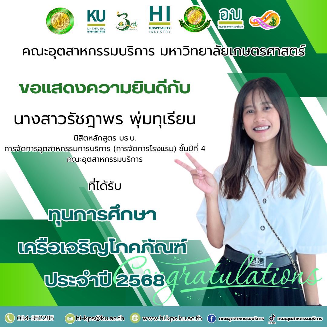 คณะอุตสาหกรรมบริการ มหาวิทยาลัยเกษตรศาสตร์ ขอแสดงความยินดีกับ นางสาวรัชฎาพร พุ่มทุเรียน นิสิตหลักสูตร บธ.บ. การจัดการอุตสาหกรรมการบริการ (การจัดการโรงแรม) ชั้นปีที่ 4 คณะอุตสาหกรรมบริการ ที่ได้รับ ทุนการศึกษา เครือเจริญโภคภัณฑ์ ประจำปี 2568