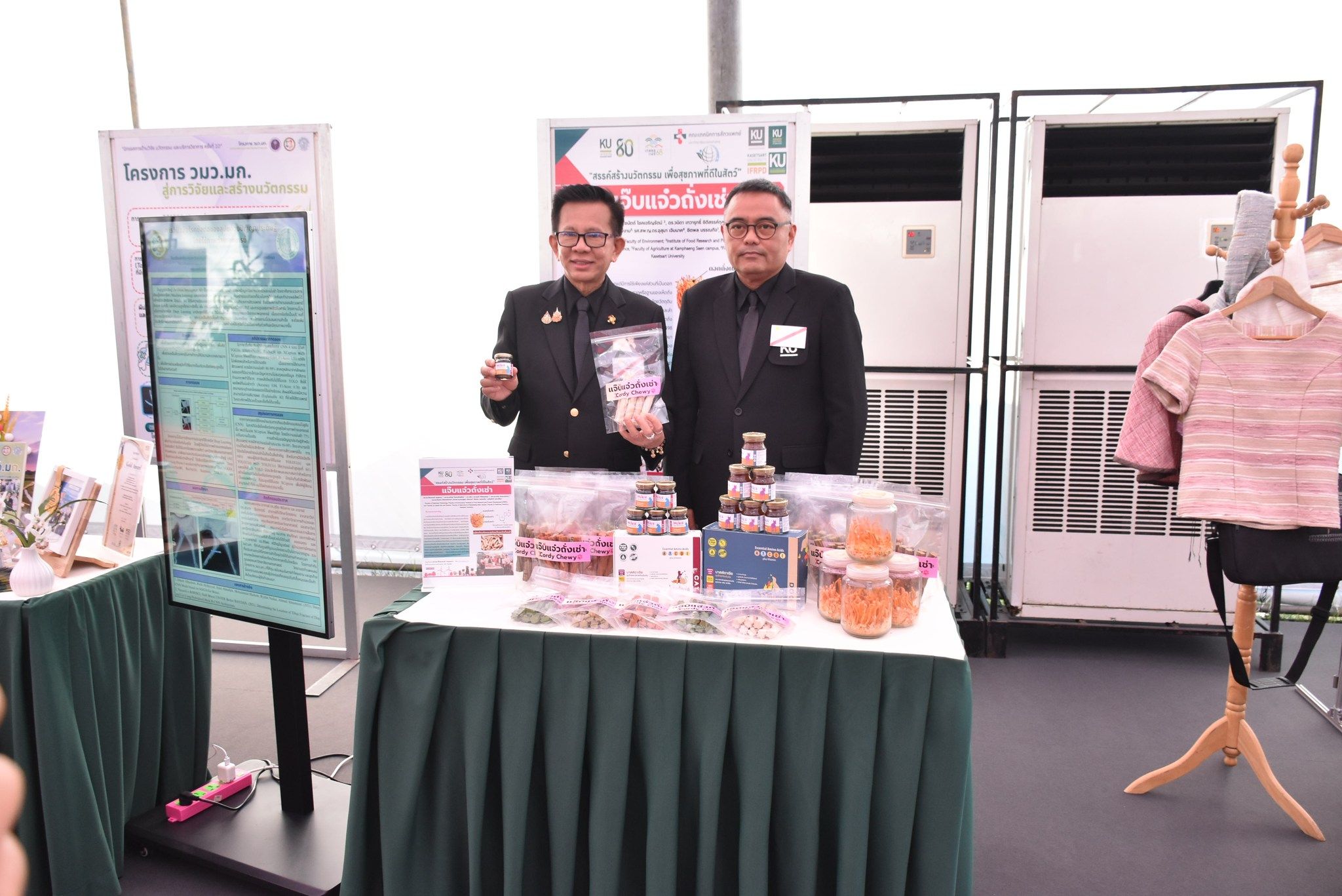 วันจันทร์ที่ 1 ธันวาคม 2568 เวลา 10.30 น. รองศาสตราจารย์ ดร.อนามัย ดำเนตร ปฐมคณบดีและผู้ก่อตั้งคณะอุตสาหกรรมบริการ ถ่ายภาพร่วมกับ ผู้ช่วยศาสตราจารย์ ดร.อาร์ม อันอาตม์งาม รองคณบดีฝ่ายวิจัย คณะศิลปศาสตร์และวิทยาศาสตร์ เนื่องในโอกาสนำเสนอผลงาน ในนิทรรศการ ด้านวิจัย นวัตกรรม และบริการวิชาการ ครั้งที่ 10 ผลงาน "ผลิตภัณฑ์ขนมสุนัขแจ๊บแจ๋วถั่งเช่า" ในพิธีเปิดงาน “เกษตรกำแพงแสน ครั้งที่ 28” ประจำปี 2568 ณ เต็นท์นิทรรศการ ด้านวิจัย นวัตกรรม และบริการวิชาการ สระพระพิรุณ มหาวิทยาลัยเกษตรศาสตร์ วิทยาเขตกำแพงแสน