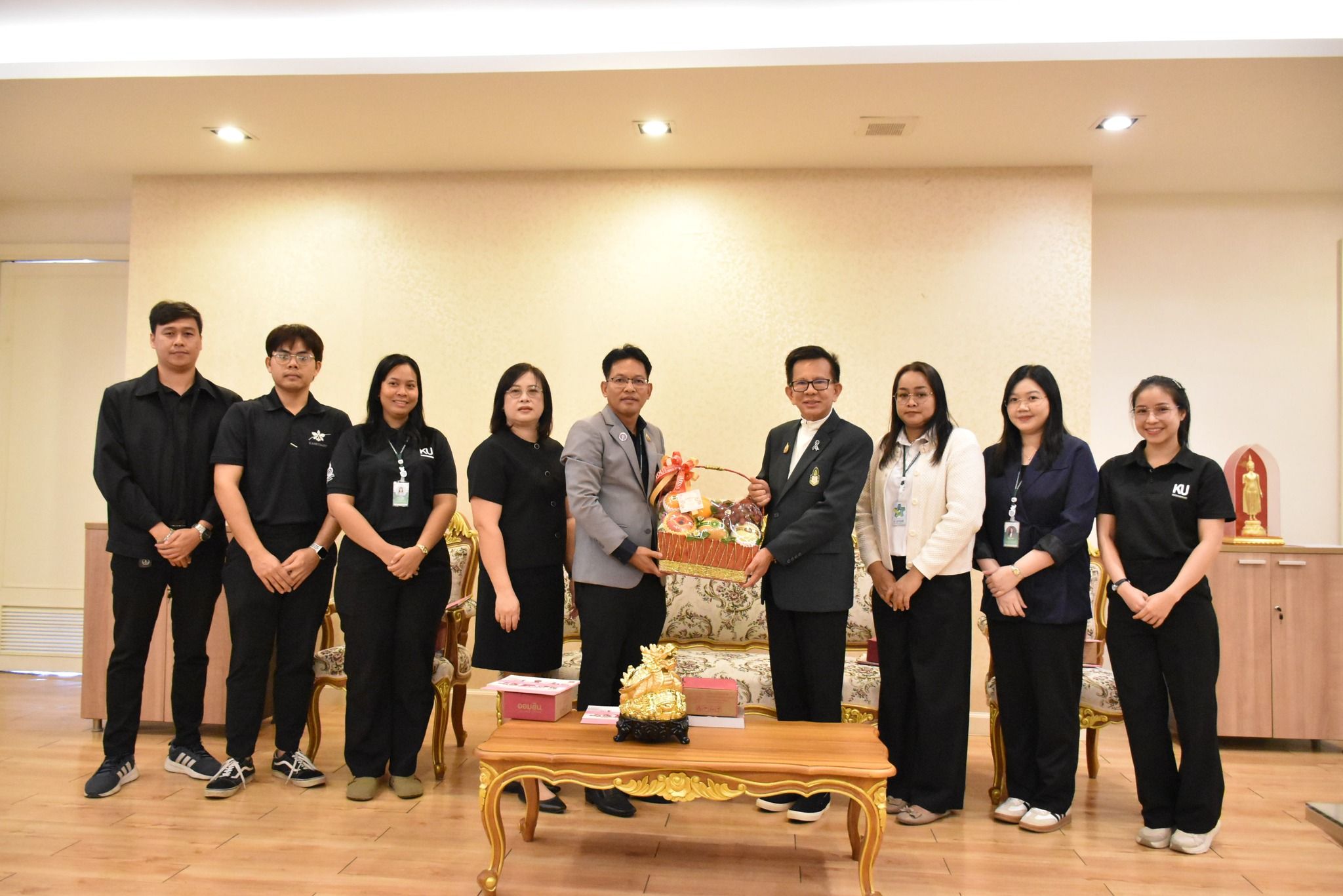 รองศาสตราจารย์ ดร.อนามัย ดำเนตร ปฐมคณบดีและผู้ก่อตั้งคณะอุตสาหกรรมบริการ ได้ให้การต้อนรับคณะผู้บริหารและบุคลากรจากกองบริหารการวิจัยและบริการวิชาการ สำนักงานวิทยาเขตกำแพงแสน ในโอกาสเข้าพบเพื่อสวัสดีปีใหม่และขอพรเพื่อความเป็นสิริมงคลเนื่องในวาระดิถีขึ้นปีใหม่ พุทธศักราช 2569 โดยคณะผู้บริหารที่ให้เกียรติเข้าพบประกอบด้วย