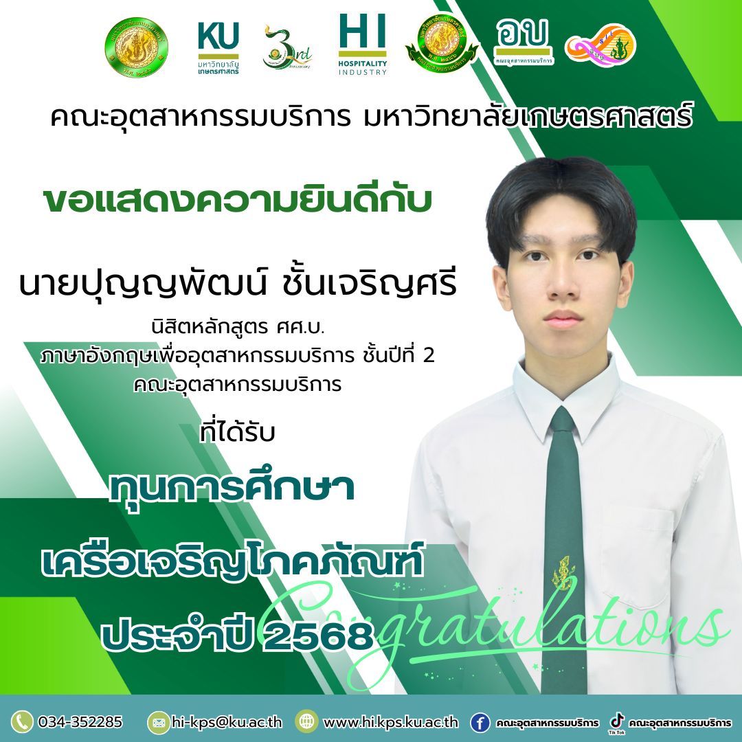 คณะอุตสาหกรรมบริการ มหาวิทยาลัยเกษตรศาสตร์ ขอแสดงความยินดีกับ นายปุญญพัฒน์ ชั้นเจริญศรี นิสิตหลักสูตร ศศ.บ. ภาษาอังกฤษเพื่ออุตสาหกรรมบริการ ชั้นปีที่ 2 คณะอุตสาหกรรมบริการ ที่ได้รับ ทุนการศึกษา เครือเจริญโภคภัณฑ์ ประจำปี 2568