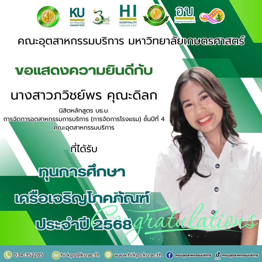 คณะอุตสาหกรรมบริการ มหาวิทยาลัยเกษตรศาสตร์ ขอแสดงความยินดีกับ นางสาวภวิชย์พร คุณะดิลก นิสิตหลักสูตร บธ.บ. การจัดการอุตสาหกรรมการบริการ (การจัดการโรงแรม) ชั้นปีที่ 4 คณะอุตสาหกรรมบริการ ที่ได้รับ ทุนการศึกษา เครือเจริญโภคภัณฑ์ ประจำปี 2568