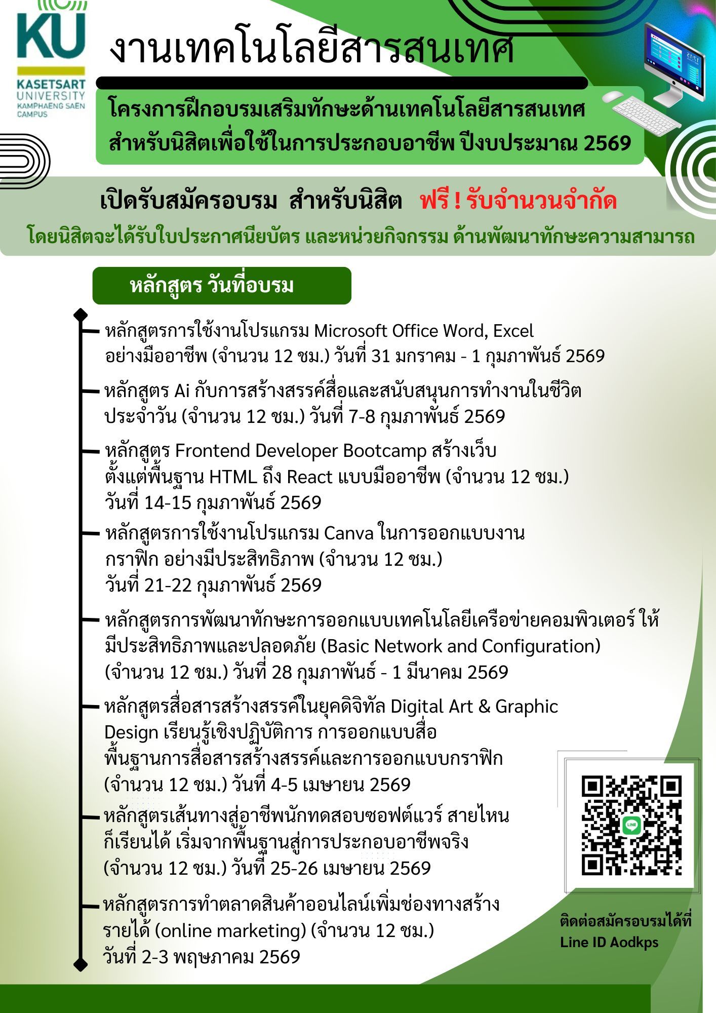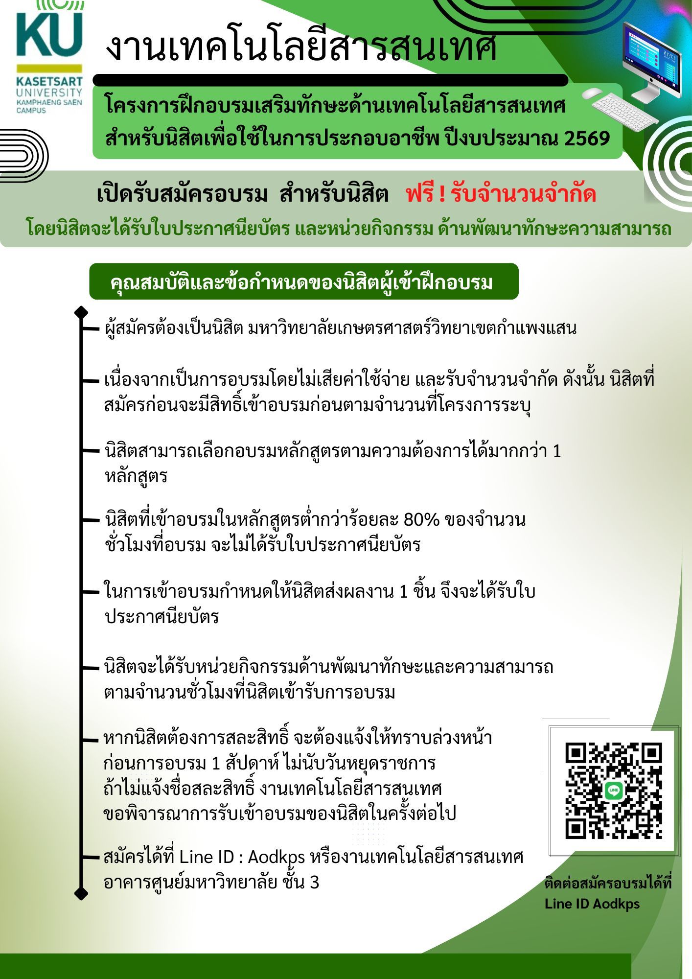 ข่าวดีสำหรับนิสิต ม.เกษตร วิทยาเขตกำแพงแสน ทั้งระดับป.ตรี และบัณฑิตศึกษา กับโครงการดีๆ ครับ #งานเทคโนโลยีสารสนเทศ มหาวิทยาลัยเกษตรศาสตร์ วิทยาเขตกำแพงแสน เปิดรับสมัครอบรมแบบออนไลน์ สำหรับนิสิต ฟรี !! #รับจำนวนจำกัด โดยนิสิตจะได้รับใบประกาศนียบัตร และหน่วยกิจกรรม ด้านพัฒนาทักษะความสามารถ